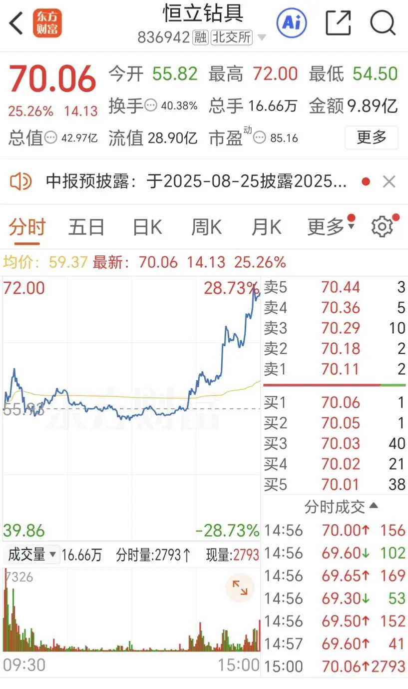 7月28日,恒立钻具以25.26%的大幅上涨收盘,报收70.06元每股。而在上周5个交易日中,恒立钻具市值涨超1.5倍,融资余额增幅更是达562.15%,成为北交所今年第一个30cm四连板涨停的个股。自21日以来,恒立钻具6个交易日股价已涨超200%。